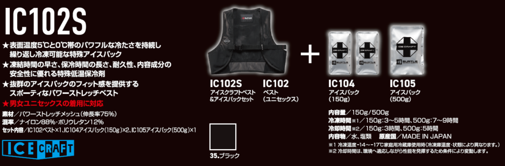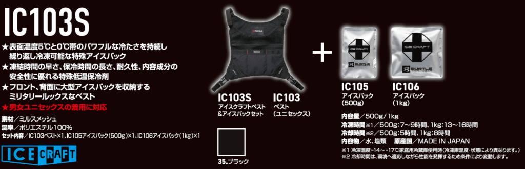 【セット内容】 ベスト(IC103)×1、アイスパック500g(IC105)×1、アイスパック1kg(IC106)×1