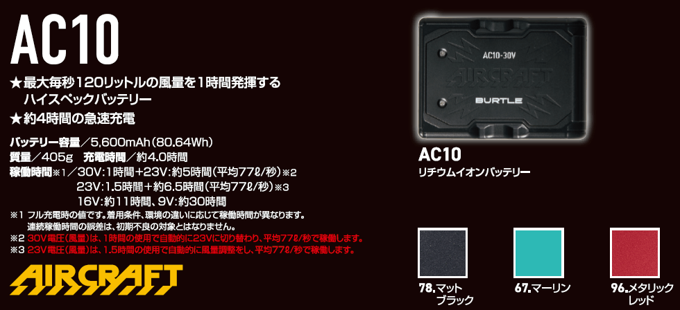 • AC10 30Vバッテリー|約4時間の急速充電で、バートル史上最強となる毎秒120Lの風量を体感可能