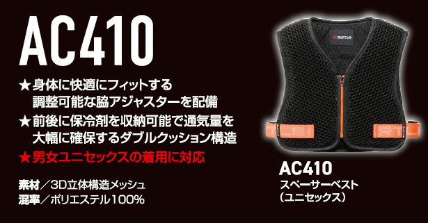 • スペーサーベスト(AC410)|フルハーネス時の風の通り道を死守するインナーもリニューアル。アイスパックを併用することで、単体使用を超える冷却効果を発揮。